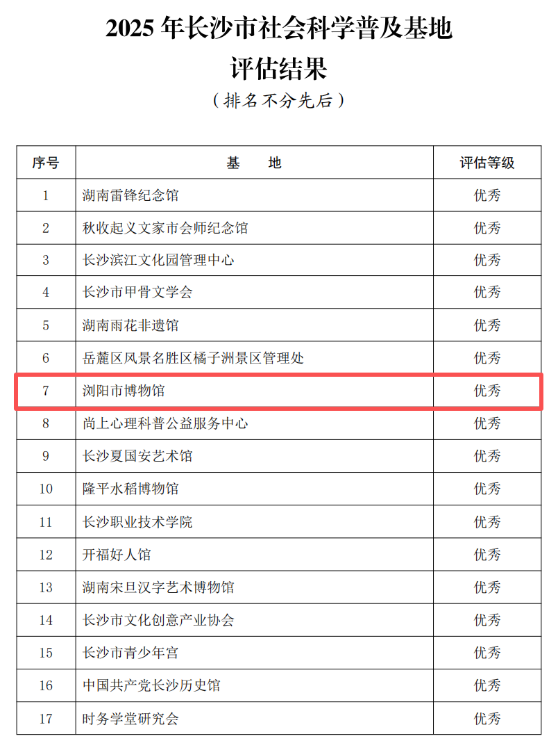 近日,长沙市社科联对2016—2023年获“长沙市社会科学普及基地”称号的单位展开评估。经过综合评审,浏阳市博物馆被评定为优秀单位。